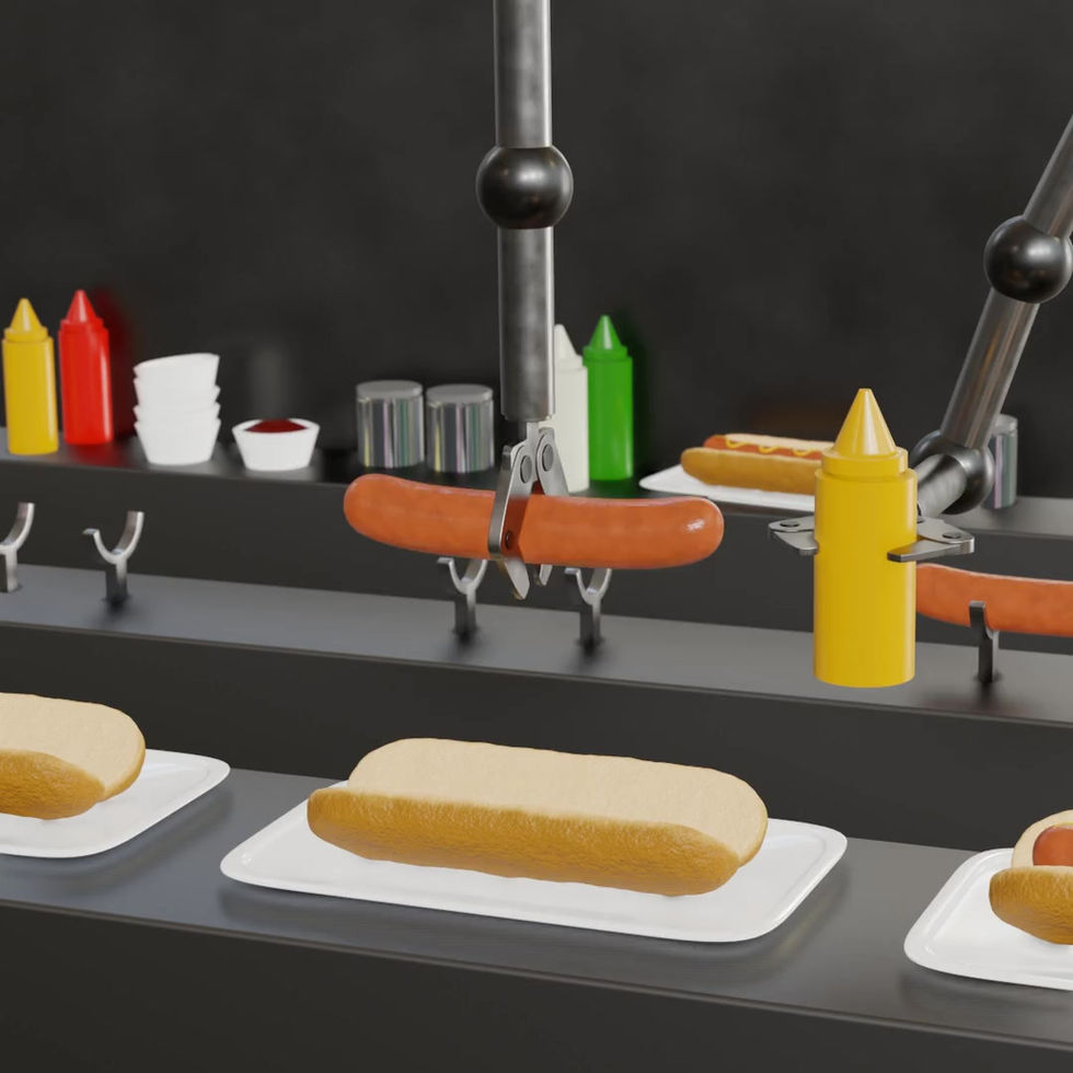 As part of a university project, I created a complete 3D scene of an automated hot dog factory in Blender, in which I modeled and animated all the objects.